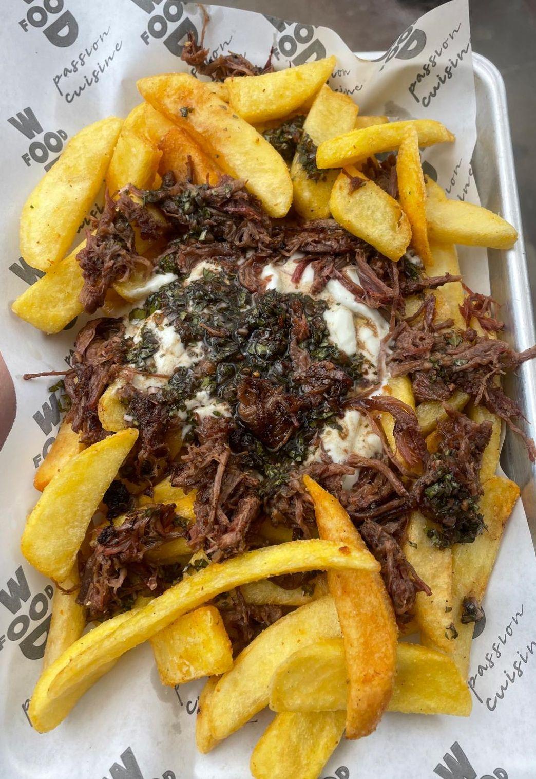 400 gr patates kızartması, odun ateşinde 12 saat pişmiş kaburga tiftik, yoğurt sos, chimichurri sos