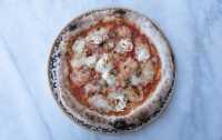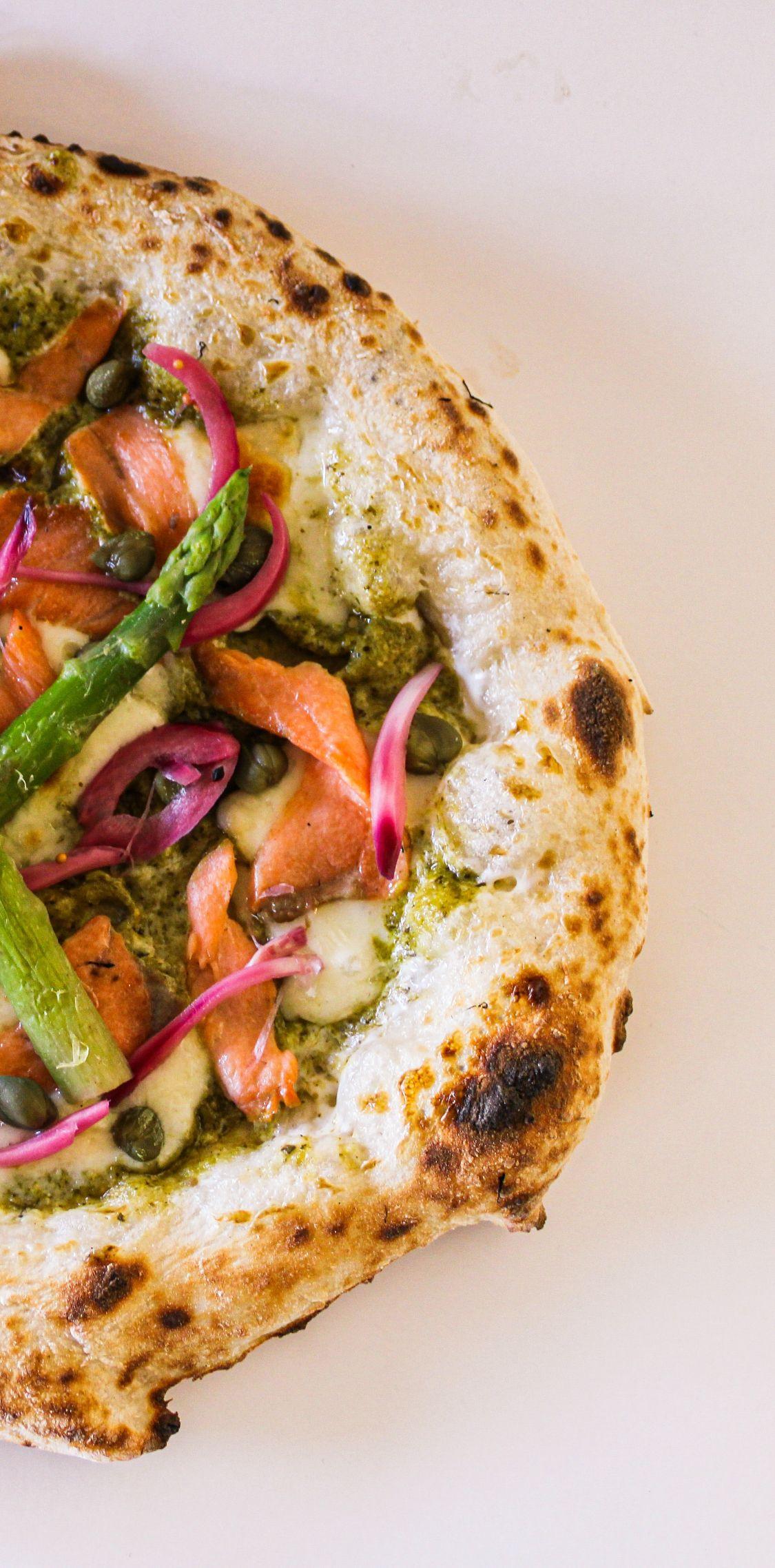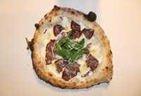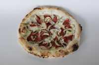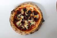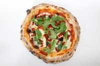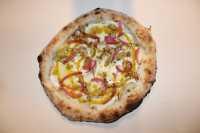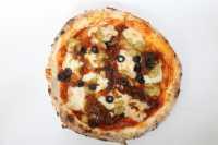 w domates sosu, mozarella peyniri, kuru domates, karamelize soğan, köz patlıcan, roka, yeşil zeytin