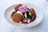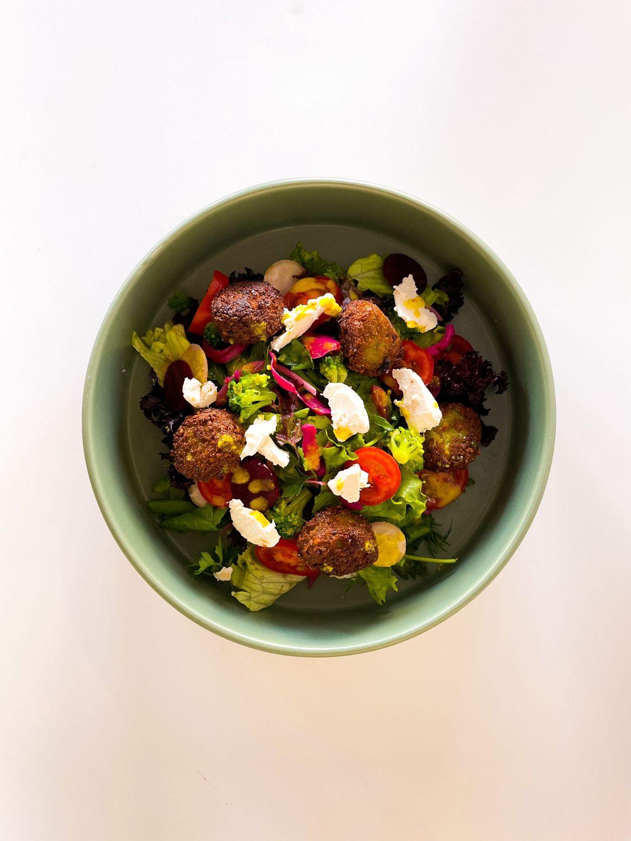 yeşillik, salatalık, havuç, çeri domates, keçi peyniri, avokado, kırmızı pancar turşusu, soğan turşusu, falafel