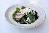 yeşillik, salatalık, havuç, ızgara tavuk, mozarella, köri sos, çeri domates, avokado, mısır, salata sos, kruton