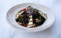 yeşillik, salatalık, havuç, küp hellim, süzme peynir, kırmızı soğan, kinoa, zeytin, çeri domates, ceviz, avokado, salata sos, kruton